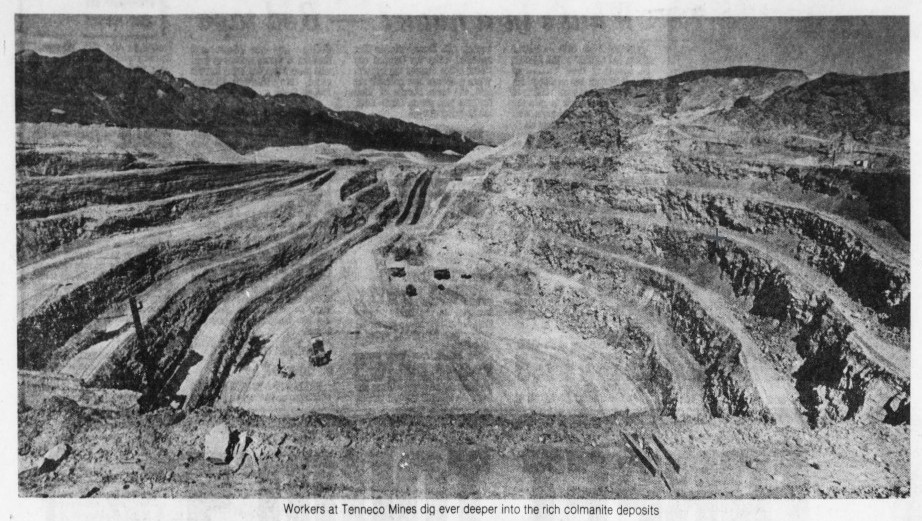 Following Tenneco’s purchase of Kern County Land, surface mining of the Boraxo mine began in January 1970, and lasted through 1977. Tenneco extracted approximately 200,000 tons of borax minerals from the open pit Boraxo mine. The mine’s waste rock can still be seen on the south side of Dante’s View Road just beyond Highway 190, hiding the scar of the former pit operation.