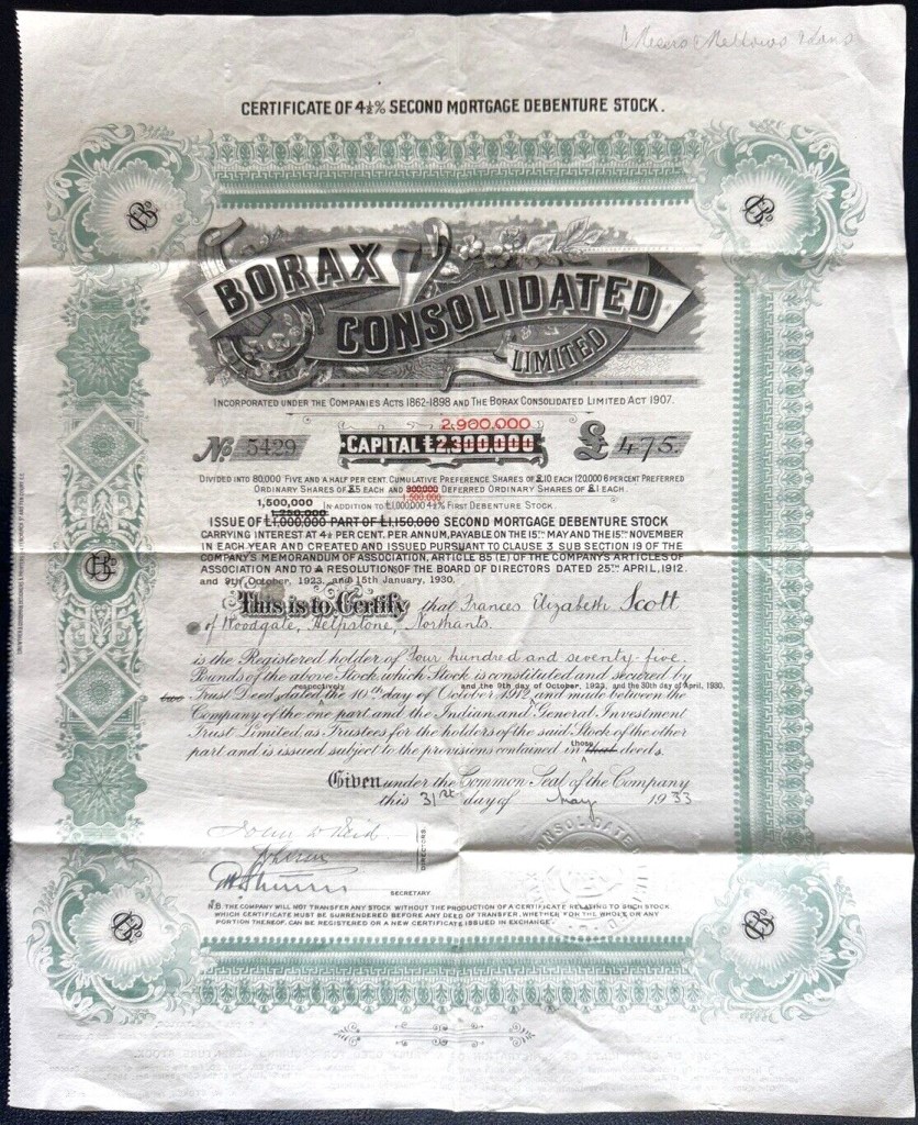 Certificate No. 4592, 4-1/2% Second Mortgage Debenture Stock, Issued to Frances Elizabeth Scott, Four Hundred Seventy-Five Pounds Sterling, May 31, 1933.
