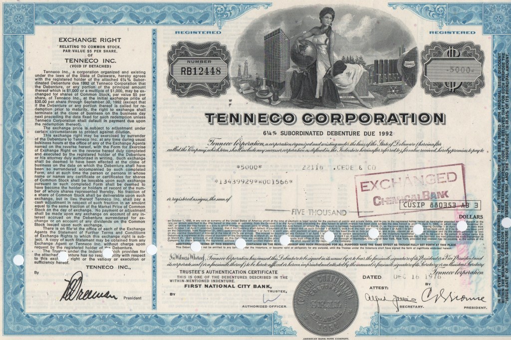 Tenneco Corporation’s origin goes back to the Chicago Corporation, established about 1930. In 1943, that company acquired the Tennessee Gas and Transmission Company to build a natural gas pipeline from Texas to West Virginia to supply energy to WWII industries in Appalachia.