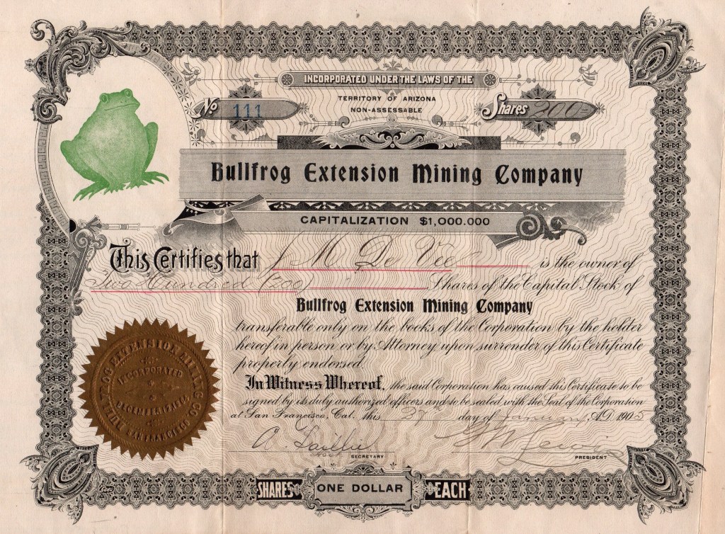 While the Bullfrog Golden Scepter boomed and busted with the rest of the District’s mines, its stock certificate, with the throned bullfrog with the gold scepter, became one of the most collectable stock certificates.