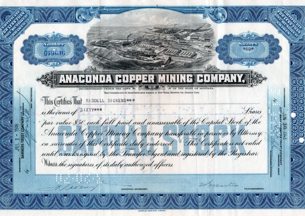 Certificate No. G79636. Sixty Shares to Riddell Dickens, June 1, 1948. J. K. Cavanaugh, Assistant Secretary; T. McMaster, Vice President.