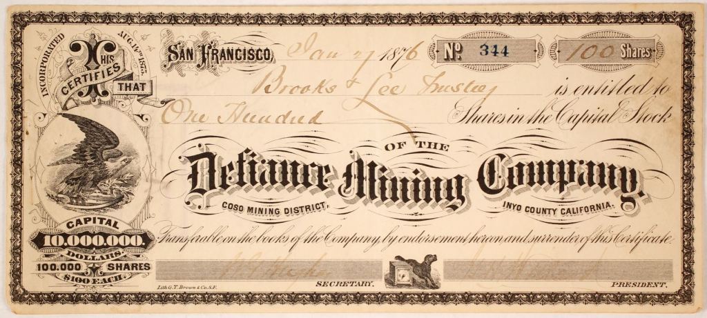 Certificate No. 344, One Hundred Shares to Brooks & Lee Trustees, January 27, 1876.