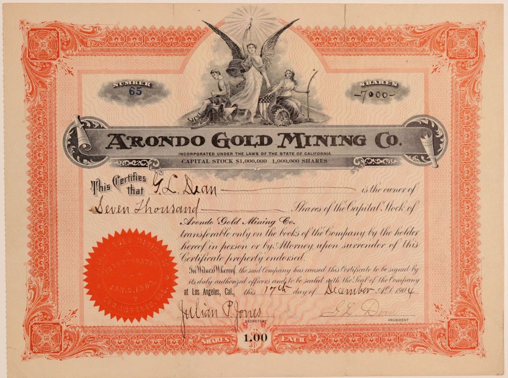 Note that the stock certificate lacks the usual statement of, “Fully paid and non-assessable.” In a legal advertisement in the Independent In November 1907, the company directors approved an assessment of 2 cents per share – not a good sign. By May 1913, it was all over for Arondo, with the company’s claims, property and water rights auctioned-off by the Inyo County Sheriff.