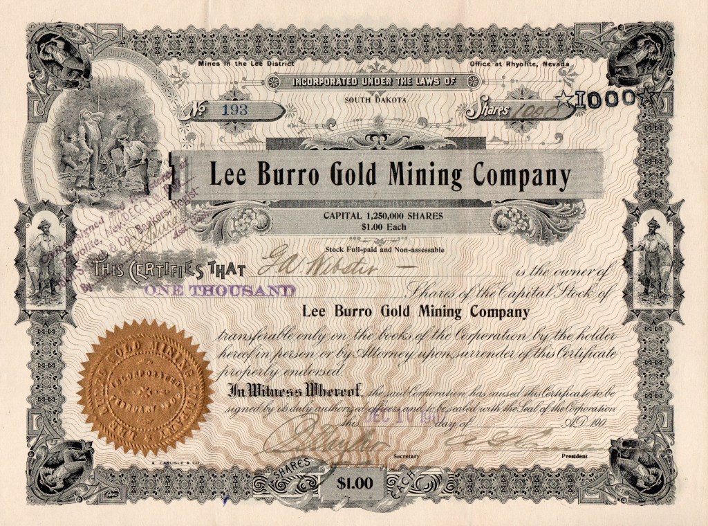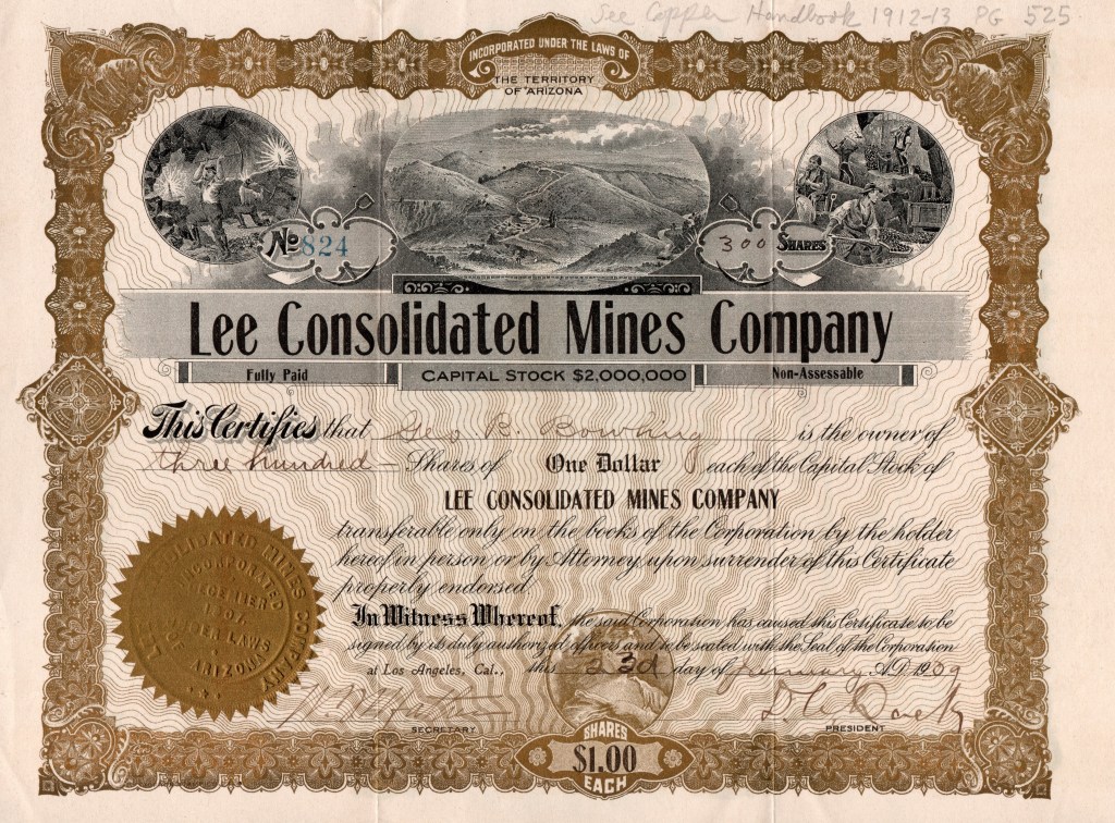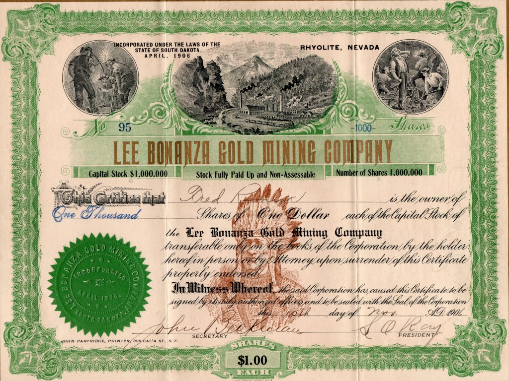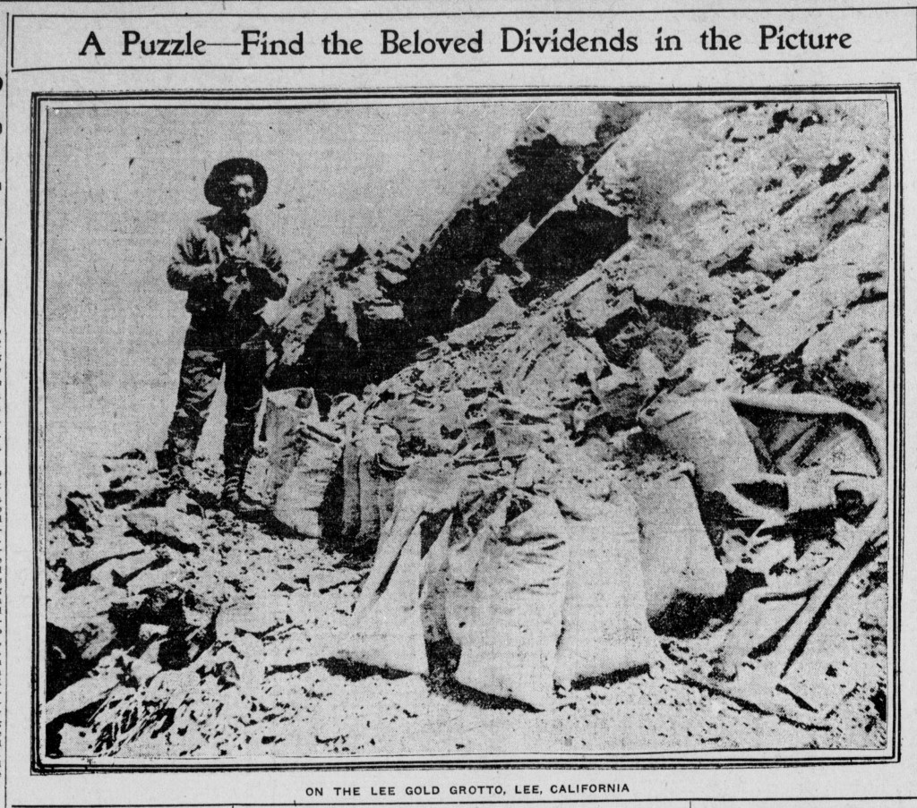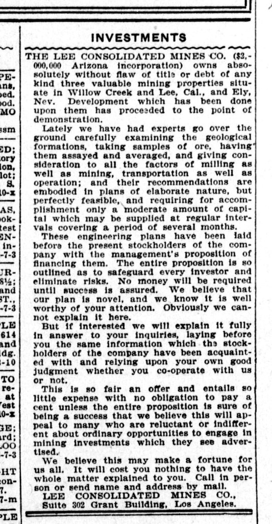 In February 1907, the Lee Bonanza reported assay values of $100 to $200, and the future looked bright – until the Panic of 1907 struck. Capital dried up, and after December 1907, the company suspended operations with having shipped any ore.