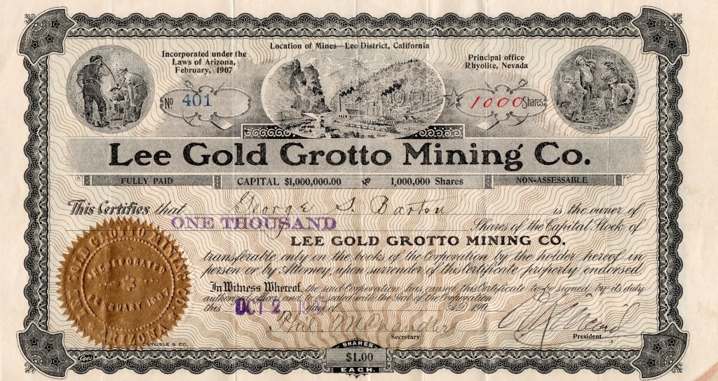 Certificate No. 401, One Thousand Shares to George S. Barton, October 2, 1907. Phil. M. Chandler, Secretary; [Illegible], President.