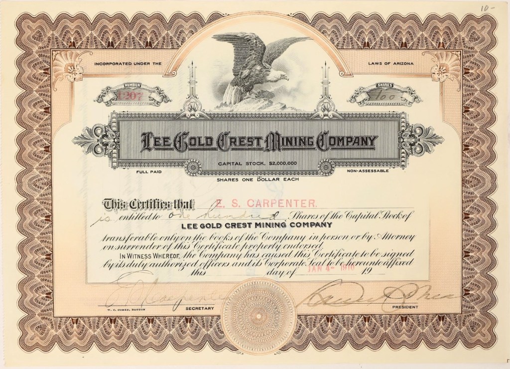 Certificate No. 1207. One Hundred Shares to E. S. Carpenter, January 4, 1910. E. D. Carpenter, Secretary; [Illegible], President.