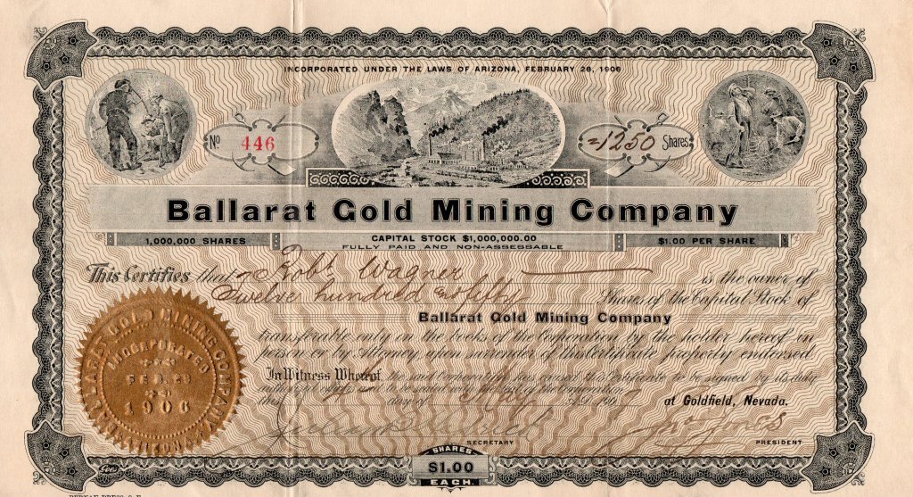 Apparently, while Ginser’s mine was now worthless, the mine’s name still held value. On February 28, 1906, notorious Nevada mining promoter John “January” Jones incorporated a new Ballarat Gold Mining Company in Arizona with a $1 million capitalization. Soon the promotions began. “I Am on the Ground at Goldfield ··· Follow Me and Win ··· Follow Me Into Ballarat ··· Buy Shares In Gold Mining Company at 15 Cents ··· I respectfully urge you to act at once in this extraordinary investment offering.”