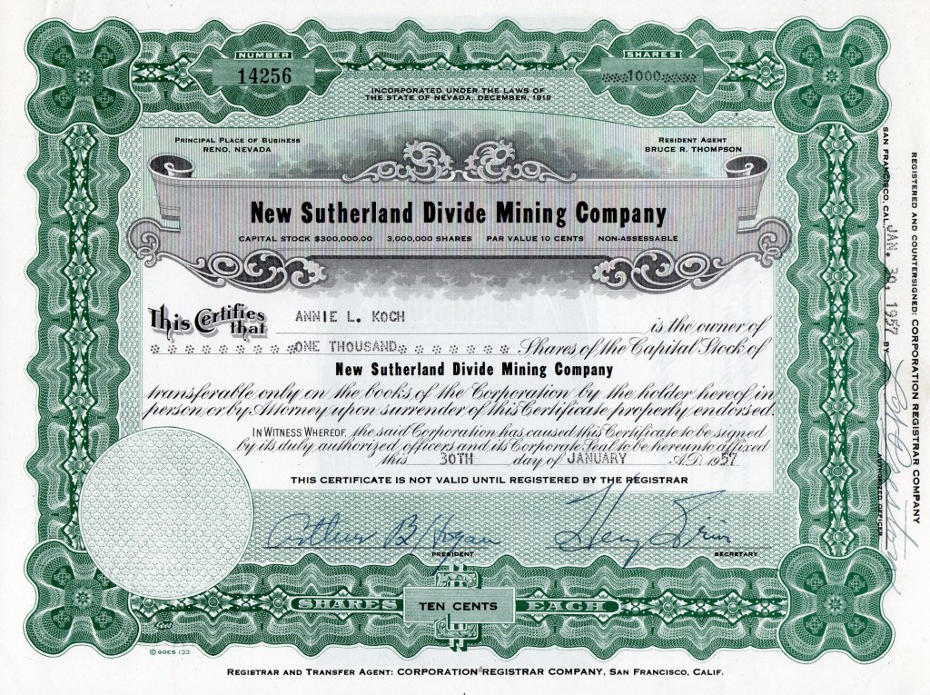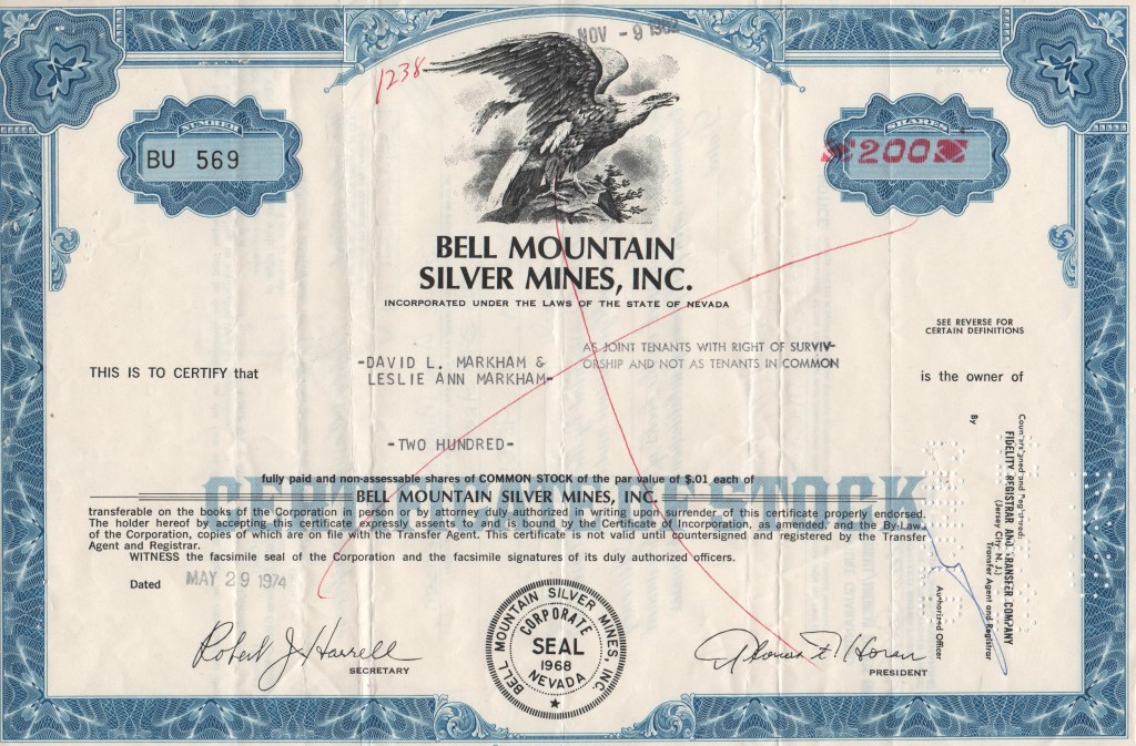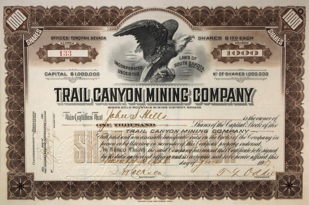 Our subsequent research into the history of the Don-Clare Mining Company led to information held by the Nevada Historical Society. Their records indicate that a Donald Finlayson (“Don?”) was a principal Don-Clare shareholder and that Clarence (“Clare?) A. Thorne was Don-Clare’s general manager. Mary Karp, the Don-Clare secretary on the stock certificate, was also described as a principal shareholder. Don-Clare owned and operated a tungsten mine in the Nevada’s Rawhide mining district in the mid-1950s.