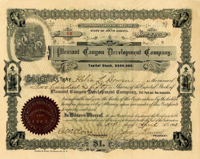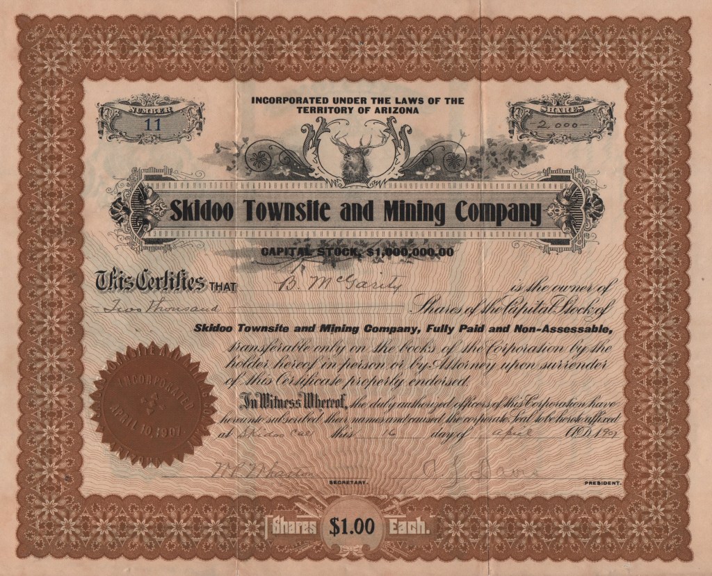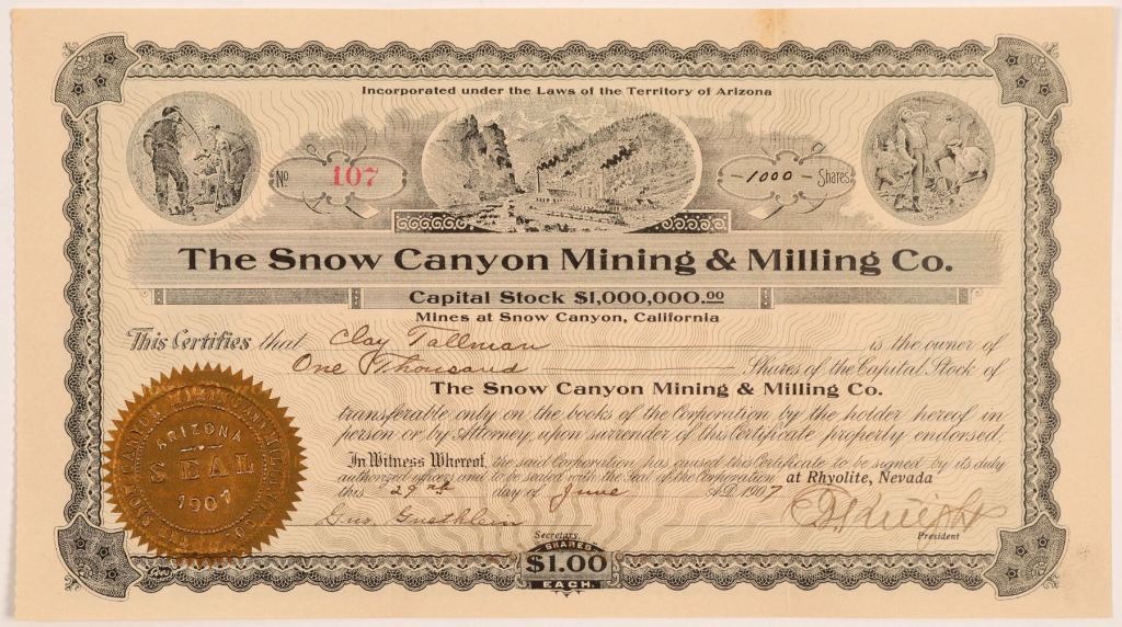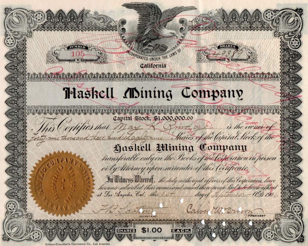 Unlike every other certificate in this collection, one thing you don’t see on the certificate is the statement, “Fully Paid and Non-Assessable.” This means that when the company directors determined that the company needed additional funds, they could hit stockholders for more money on a per-share basis. If an owner didn’t pay an assessment, the company could, and in several instances did, auction the delinquent owners’ shares at a public auction. Assessments were levied for several years from 1907 to 1915.