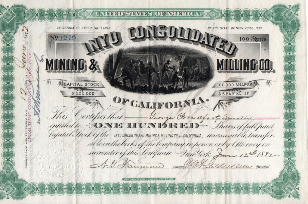 This certificate was obtained from the Holabird Americana auction house of Reno, Nevada. Owner Fred Holabird, former mining geologist, related information about the Don-Clare Mining Company. Fred’s story, and information gleaned from additional research, illustrates how over time, memories may not always jibe with written, reported information: