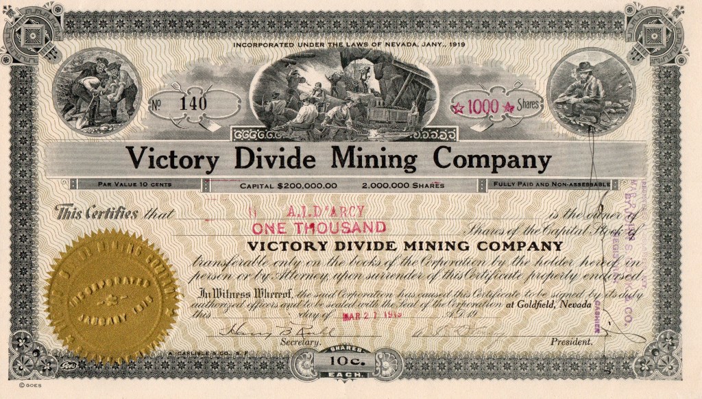 A few years later, they subleased the mine to another corporate shell, the Reorganized Victory Divide Mining Company, run by A. I. D’Arcy, who made a show of reopening the Carbonate and Queen of Sheba mines. D’Arcy worked the Victory stock up from 3 cents to 13 cents while he unloaded his own holding, then let it crash in the summer of 1926.