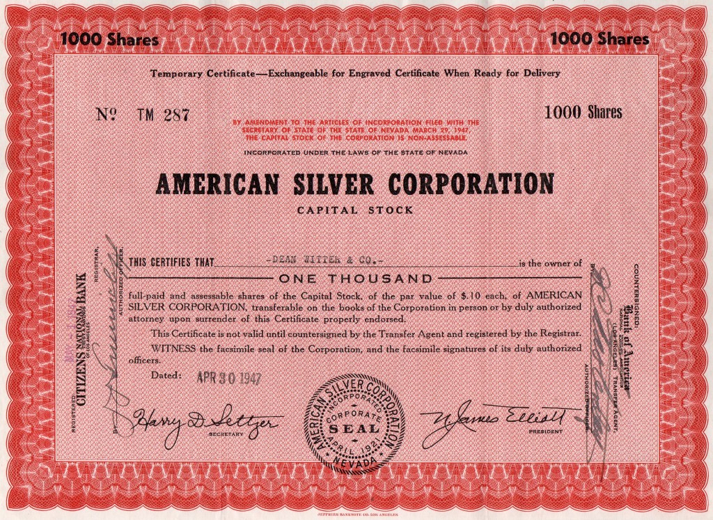 Temporary Certificate No. TM270. One Thousand Shares to Dean Witter & Co., April 30, 1947. Harry D. Settzer (?), Secretary; N. [Nathan] James Elliott, President.