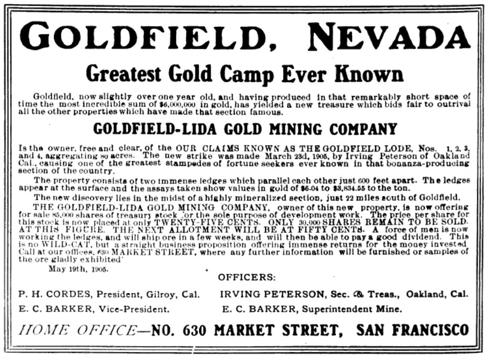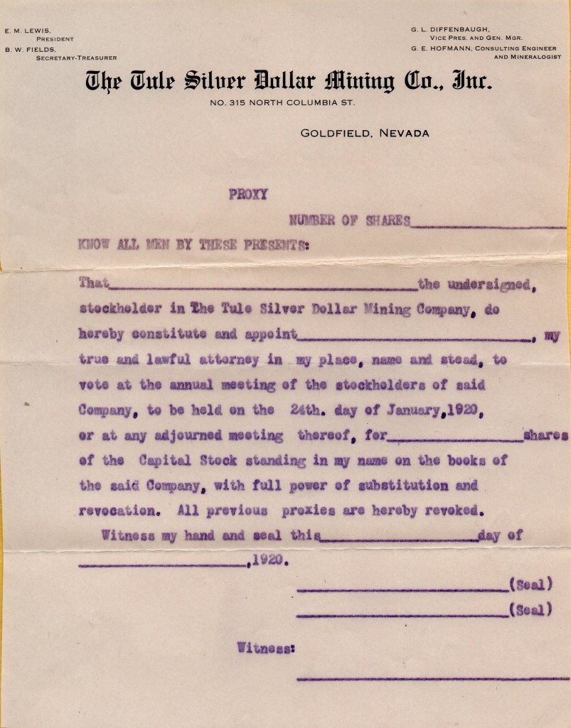 The Tule Silver Dollar Mining Company was incorporated in July 1919. The company owned five full claims 45 miles south of Goldfield and 12 miles from Hornsilver, in the Tule Canyon Mining District, one-half mile from the Nevada – California state line.