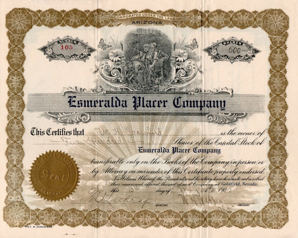 Certificate No. 49, Ten Thousand Shares to A. C. Sandberg, September 23, 1905. J. M. Davis, Secretary; Harry Smirkin (?), President.