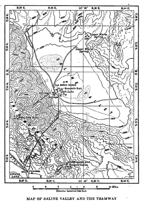 The Southern Pacific Railroad completed the rail line into Owens Valley around 1910 to support the construction of the Los Angeles aqueduct. The Smiths considered constructing a railroad spur or a pipeline for brine between the Southern Pacific to Saline Valley. Both options were determined to be too costly. Ultimately, they decided to construct a 13.4-mile aerial tramway from Saline Valley, up and over the Inyo Mountains to the railroad that skirted the east shore of Owens Lake.