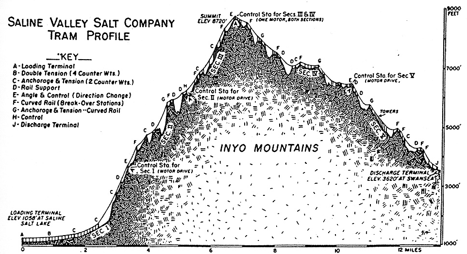 The tramway spanned approximately 13.4 miles and ascended nearly 7,500 feet in elevation from Saline Valley to Keeler, on the eastern shore of Owens Lake. At the time, it was one of the steepest and longest tramways in the world. It included over 300 towers to carry the cable and cars.